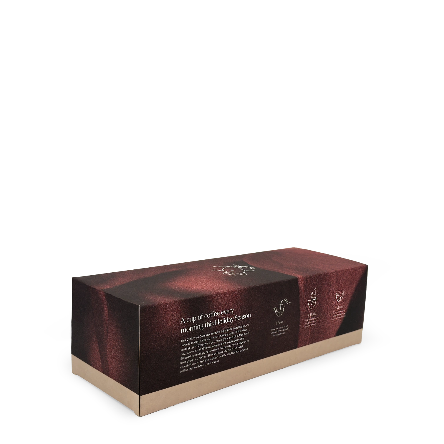 In the days leading up to Christmas, you can enjoy 24 servings of 8 different coffees, each packaged using Steeped technology to maintain the quality and character of freshly ground coffee.